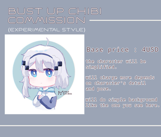 T.O.S FORTHIS EXPERIMENTAL STYLE COMMISSION- I only do bust up chibi,not more and less than that- Please take note that this is experimental type so it may take some times to match with this kind of style- There's no lighting for this one- No complicated background